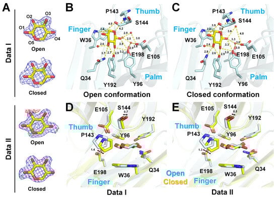 The electron density map was observed for the entire amino acid sequence (Thr29-Trp211), excluding the N-terminus. The overall structure of TsaGH11-XYP exhibited a typical β-roll fold resembling a right hand, consisting of finger, palm, and thumb domains (Figure 1A), which indicates that the XYP molecule does not affect the overall structure of TsaGH11. The substrate-binding cleft of TsaGH11 is located between the finger and thumb domains and contains six subsites for xylan substrate binding (Figure 1B). The two TsaGH11 molecules in the asymmetric unit displayed distinct open and closed conformations between the finger and thumb domains (Figure 1C,D). These distinct conformations of TsaGH11 are influenced by the crystal packing effects, which are similar to the previous TsaGH11 structure from the identical tetragonal crystal form [29,32]. In the open conformation of TsaGH11-XYP (Molecule A), the distance between the CH2 atom of Trp36 and the CB atom of Pro143 from Data I and Data II was 5.35 and 5.53 Å, respectively (Figure 1C). In the closed conformation of TsaGH11-XYP (Molecule B), the distance between the CZ2 atom of Trp36 and the CB atom of Pro143 from Data I and Data II was 4.17 and 4.25 Å, respectively (Figure 1D). This indicates that the substrate-binding cleft may be slightly altered depending on the XYP soaking time (see below).