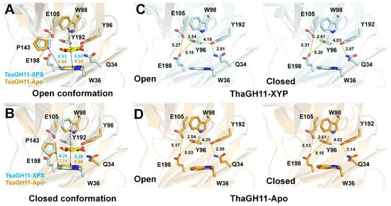 Regarding the conserved Tyr residues in the palm domain of the TsaGH11-XYP open conformation, the hydroxyl group of Tyr96 interacted with the OE2 atom of Glu105 and the OE1 atom of Glu198 at a distance of 2.54 Å and 5.16 Å, respectively. The hydroxyl group of Tyr192 interacted with the NE1 atom of Gln34 and the hydroxyl group of Tyr96 at a distance of 2.81 Å and 4.18 Å, respectively (Figure 3C). In the TsaGH11-XYP closed conformation, the hydroxyl group of Tyr96 interacted with the OE2 atom of Glu105 and the OE1 atom of Glu198 at a distance of 2.61 Å and 5.20 Å, respectively. The hydroxyl group of Tyr192 interacted with the NE1 atom of Gln34 and the hydroxyl group of Tyr96 at a distance of 3.07 Å and 4.03 Å, respectively (Figure 3C).