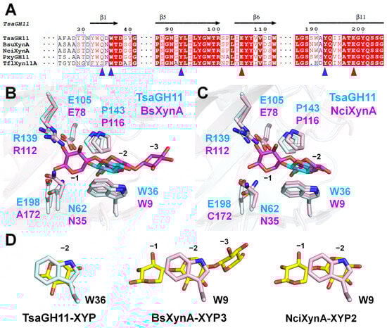 Amino acids and structural comparison of TsaGH11-XYP with other GH11 family proteins. (A) Partial multiple sequence alignment of TsaGH11 (UniProt: I3VTR8) with BsXynA (P18429), NciXynA (P09850), PxyGH11 (A0A0M9BNX9), and TflXyn11A (Q8GMV7). The catalytic and XYP-binding residues in TsaGH11-XYP are indicated by red and blue triangles, respectively. Superimposition of TsaGH11-XYP (cyan) compared with (B) BsXynA-XYP3 (PDB code: 2QZ3, pink) and (C) NciXyn-XYP2 (1BCX, pink). (D) Interaction between XYP molecule and Trp residues from TsaGH11-XYP, BsXynA-XYP3, and NciXyn-XYP2.