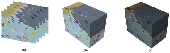 The process of microstructure reconstruction involves: (a) processing individual layers; (b) stacking all layers and synthesizing an exact microstructure; and (c) generating a finite element model.