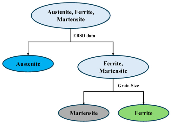 To precisely distinguish ferrite and martensite phases in medium-Mn steels, both the scanning transmission electron microscopy via energy-dispersive spectroscopy (STEM-EDS) and X-ray diffraction (XRD) analysis have been used in the literature [47,48]. However, it remains a great challenge to combine these techniques with serial EBSD so that a fully resolved polycrystalline microstructure with precise phase information can be reconstructed. Alternatively, leveraging the reported grain size difference between ferrite and austenite, one could separate the two phases in an approximated fashion following the procedures in Figure 2.