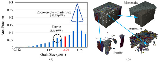 (a) Grain size distribution of martensite and ferrite computed from the grain area distribution in Ref. [3]; (b) separated austenite, ferrite, and martensite phases in the microstructure. The white block demonstrates the subdomain that will be used later.