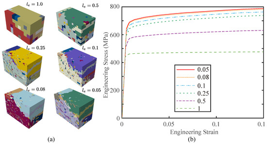A series of gradually coarsened meshes is reconstructed using the reconstruction resolutions between 0.05 and 1.0 μm and meshing each pixel into one element (i.e., mesh size is equal to the reconstruction resolution). The corresponding mesh information is reported in Table 1. The reconstructed microstructures are illustrated in Figure 4a, while the stress-strain responses (using the parameters from Ref. [6]) are plotted in Figure 4b. For the martensite, BCC slip systems are used to approximate the BCT slip systems due to the low carbon content, which is expected to have a negligible change in the lattice parameters [49].