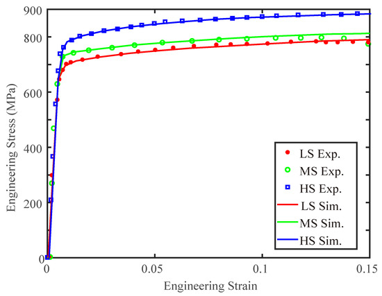 While the material parameters start from our previous work [6], additional fine-tuning is conducted to match the experimental stress-strain curve from previous work [3,6]. This fine-tuning is needed since the current study uses a fully resolved microstructure, while the previous work considered the phase volume fraction only when using the Taylor model. Specifically, three different strain rates are considered, including a low strain rate (LS, /s), a medium strain rate (MS, ), and a high strain rate (HS, /s), using the mesh size of 0.08 μm. The calibration process yields a good match between the experiments and simulations across the three different strain rates as shown in Figure 5. The slightly adjusted material parameters are provided in the Appendix A for simplicity.