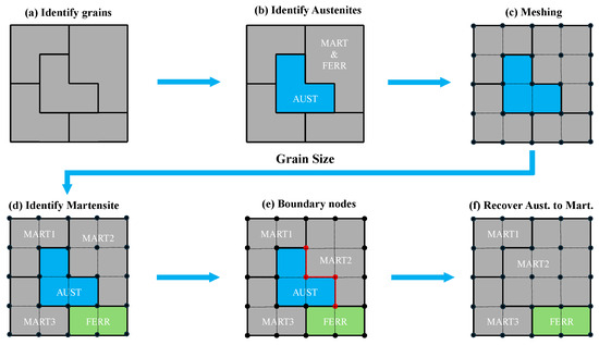 Given that austenite originates from a parent martensite, each austenite grain is typically encompassed by martensite grains. Therefore, the approach is to identify the neighboring martensite (parent martensite) for each UFG austenite and change each austenite to its parent martensite. The neighboring information is obtained by searching the shared grain boundary nodes between two grains. When an austenite grain is neighboring multiple martensite grains, the martensite that shares the maximum number of grain boundary nodes is deemed the parent martensite of that specific austenite. If an austenite grain has the same number of neighboring nodes with more than one martensite grain, it will be randomly changed to one of the martensite grains. Figure 6 illustrates the procedure, where the initial four steps in (a)–(d) outline the microstructure reconstruction process and the identification of three distinct phases. Steps (e) and (f) illustrate the process of determining the parent martensite of the austenite and recovering the austenite to its parent martensite.