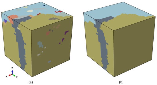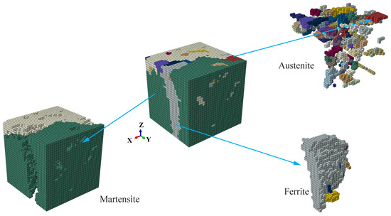 Utilizing this methodology, it becomes possible to create two distinct microstructural models: one that includes austenite and another that represents the microstructure before the intercritical annealing and free to austenites, enabling a comprehensive comparison and analysis. However, due to the large number of elements in the generated finite element model, which would result in a time-consuming simulation process, we, therefore, select a subdomain extracted from the entire model for more efficient analysis, as shown in Figure 7, and further use an element size of 1.0 μm since it provides close enough results compared to the 0.08 μm mesh size, but with a significantly smaller number of elements and nodes (e.g., see Table 1). This particular subdomain is chosen because it contains a cluster of UFG austenites (9% volume fraction of austenite), and its location in the whole microstructure is shown in Figure 3a. The two models are shown in Figure 8, and we will call these two models the model with austenite and the model without austenite.