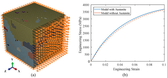(a) Boundary conditions of the finite element model; (b) Stress-strain curves of the model with and without austenites.