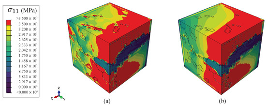 Figure 10 shows the contour of stress component in the models with or without austenite at 50% of the applied load. It should be noted that while the stress distributions on the face might be influenced by the boundary conditions, ferrite generally exhibits a lower stress level. When comparing models with and without austenite, an apparent high stress level is observed in the austenite region, suggesting austenite’s contribution to the increased strength.
