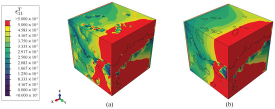Distribution of true strain at 50% of the applied loading for (a) the model with austenites and (b) the model without austenites.