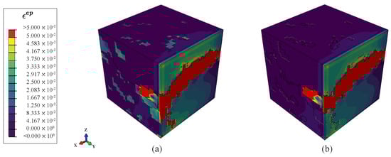 Distribution of equivalent plastic strain at 50% of the applied loading for (a) the model with austenites and (b) the model without austenites.