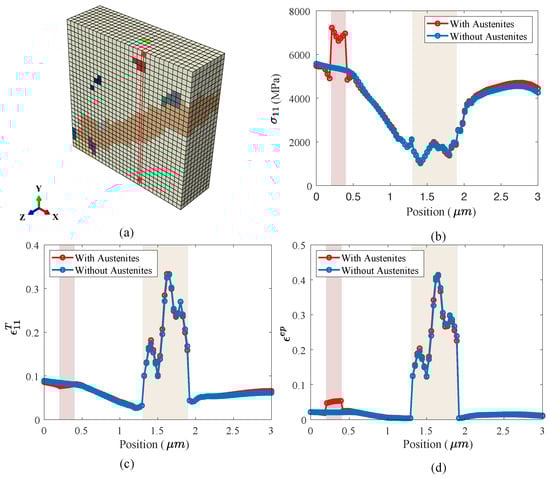 Figure 13b–d illustrate the values of stress component , true strain component , and equivalent plastic strain , respectively, along a specific path in the microstructure. This path was created at the same position in both models, as shown in Figure 13a, starting from a martensite and crossing an austenite and a ferrite. The figures demonstrate that the responses for models with and without austenites are largely similar, with the notable exception of the austenite regions. In these regions, the curve representing the model with austenite exhibits much higher stress (about 25% higher) and plastic strain (about 50% higher) values compared to the model without austenite but only marginally lower true strain. These observations from the inside of the microstructure are consistent with the observations from the surface of the microstructure shown in the contour plots of Figure 10, Figure 11 and Figure 12. This again confirms that austenite carries much greater plastic deformation and higher stresses, which could significantly contribute to ductility and high strength, making it a valuable component in the material’s overall performance.