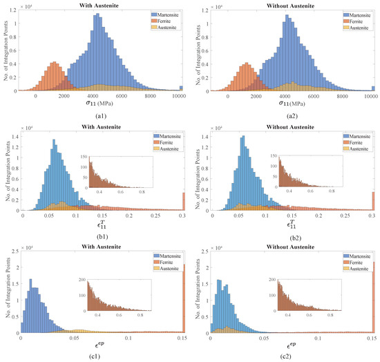 Histogram of stress component , true strain , and equivalent plastic strain at the end of applied loading: (a1,b1,c1) are results of the model without austenite; (a2,b2,c2) are results of the model without austenite.