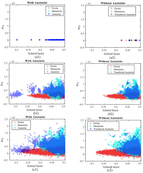 Correlation between Schmid factor and stress component at (a1,a2) 0% of loading, (b1,b2) 50% of loading, and (c1,c2) 100% of loading.