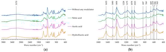 FTIR-ATR spectra of the MIL-101(Cr)-SO3H samples synthesized without any modulator and using either hydrofluoric acid, acetic acid, or nitric acid as the modulator: (a) full spectra; (b) detail of the spectra in the 400–1800 cm−1 range.