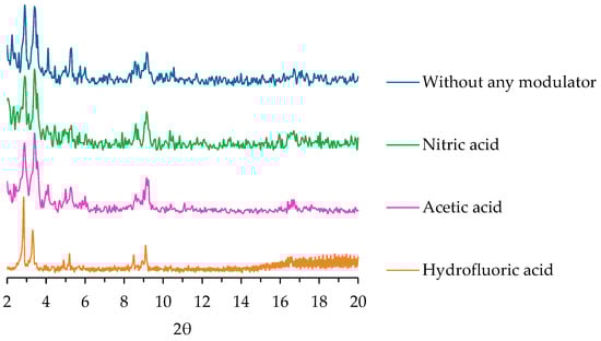 Figure 3 represents the PXRD patterns of the MIL-101(Cr)-SO3H samples synthesized without any modulator and using either hydrofluoric acid, acetic acid or nitric acid as the modulator. All the patterns are in good accordance with previous studies on MIL-101(Cr)-SO3H [36,46,47,48] with slight differences in the position and relative intensities of the peaks among the patterns, thus confirming the successful synthesis and structural integrity of the four MOFs synthesized in this work. The PXRD patterns of all samples show the main characteristic diffraction peaks of MIL-101(Cr)-SO3H at 2.9, 3.4, 4.1, 5.3 and 9.2°, attributed to the reflection planes of (220), (311), (400), (511) and (911), respectively [49]. The four samples also exhibit the characteristic diffraction peaks of MIL-101(Cr) at 5–9.5° [36,50]. The negligible peaks in the region 2θ = 16–20° affirm the successful removal of unreacted ligand crystals from the sample’s framework [45]. The PXRD pattern of the sample synthesized with hydrofluoric acid possesses the narrowest peaks of the series, which is consistent with the larger crystal size observed in Figure 2d. The elevated background noise observed might be attributed to the irregular arrangement of –SO3− groups and the substantial Compton-modified scattering originating from organic bridges within MIL-101(Cr)-SO3H [27]. These bridges consist of numerous lightweight atoms such as carbon, oxygen, and hydrogen [49].