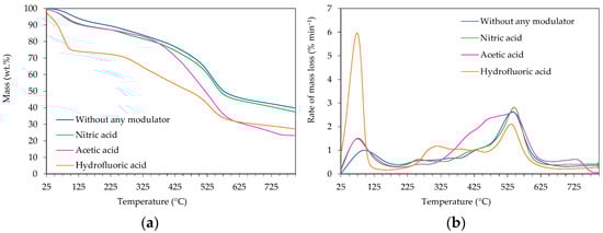 Figure 4 shows the TG curves and the weight loss of the MIL-101(Cr)-SO3H samples synthesized without any modulator and using either hydrofluoric acid, acetic acid, or nitric acid as the modulator. Three main stages of mass loss can be distinguished, which are quantified in Table 2. The first stage of mass loss, with maxima between 77 and 103 °C, corresponds to the desolvation of the framework: the evaporation of solvent molecules within the pores and removal of water molecules. As can be seen in Table 2, the mass loss observed at this stage was significantly greater for the sample prepared using hydrofluoric acid as the modulator, which presented a mass loss of 27 wt.% below 200 °C. This might be attributed to the fact that this sample was washed making use of a less efficient washing procedure. The second stage of mass loss, which occurs in the temperature range between 200 and 400 °C, has a closer magnitude for all samples (11–16%). This is attributed to the thermal decomposition of the sulfonic acid moiety [51]. The third stage of mass loss, which occurs above 400 °C, corresponds to the departure of the remaining OH− ions, detachment of the organic linker, followed by the decomposition of the entire framework. This presents its maxima at ca. 540 °C. In this stage, the sample synthesized making use of acetic acid as the modulator exhibited the highest mass loss, 52 wt.%, whereas the sample synthesized with hydrofluoric acid presented the lowest mass loss, 30 wt.%. Overall, these results closely align with previous reports for MIL-101(Cr)-SO3H [23,37,52].