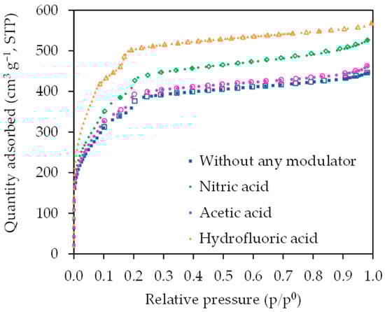 Figure 5 shows the N2 adsorption isotherms at −196 °C of the MIL-101(Cr)-SO3H samples synthesized without any modulator and using either hydrofluoric acid, acetic acid, or nitric acid as the modulator. The filled symbols correspond to the adsorption data and the empty symbols to the desorption data. The adsorption isotherms show a type IVb topology, according to the updated classification proposed by the IUPAC [28] with completely reversible adsorption and desorption, characteristic of materials with narrow mesopores or cylindrical tapered end mesopores. All the isotherms shown in Figure 5 show five distinct zones: (i) a nearly vertical N2 uptake is observed in the lowest-relative-pressure region corresponding to the filling of the narrowest micropores; (ii) then a somewhat less steep increase in the amount of N2 adsorbed up to relative pressures of ca. 0.1; (iii) followed by a stage with an even softer slope; (iv) then a second steep zone ending at a relative pressure in the 0.2–0.3 range, with the actual ending point depending on the sample: 0.23 for the sample synthesized without any modulator, 0.30 for the sample synthesized using nitric acid as the modulator, 0.25 for the sample synthesized using acetic acid as the modulator, and 0.20 for the sample synthesized using hydrofluoric acid as the modulator; (v) the final stage consists of a gradual but moderate uptake that nearly resembles a plateau compared to the previous stages, which ends with a somewhat steeper slope at relative pressures close to unity. The overall isotherm topology resembles two consecutive steps that correspond to the filling of the micropores and the mesopores, respectively, which is consistent with the literature on MIL-101(Cr)-SO3H [12,22,34,46].