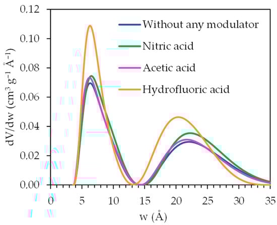 Figure 6 represents the PSD of the MIL-101(Cr)-SO3H samples synthesized without any modulator and using either hydrofluoric acid, acetic acid, or nitric acid as the modulator. Figure 6 shows a bimodal distribution with maxima at 6 Å and at 20 Å for the sample synthesized with hydrofluoric acid, 6 Å and at 22 Å for the sample synthesized with acetic acid, 7 Å and at 22 Å for the sample synthesized with nitric acid, and at 6 and 22 Å for the sample synthesized without any modulator. These bimodal PSD can be ascribed to the pentagonal windows with 5–12 Å pore width and the pentagonal–hexagonal windows with 12–20 Å pore width of MIL-101(Cr) [31,45]. Previously published PSDs for MIL-101(Cr)-SO3H only show the range 10–100 Å, with pores with a width of 10–20 Å [35] or 10–30 Å [46,47].