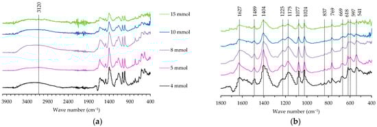 FTIR-ATR spectra of the MIL-101(Cr)-SO3H samples synthesized with increasing doses of acetic acid: (a) full spectra; (b) detail of the spectra in the 400–1800 cm−1 range.