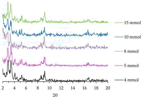 Figure 8 shows the PXRD patterns of the MIL-101(Cr)-SO3H samples synthesized with increasing doses of acetic acid. The patterns of all samples present the expected diffraction peaks, described in Section 3.1, with minor variations in the position of the peaks. Therefore, they confirm the successful synthesis and structural integrity of the five samples.