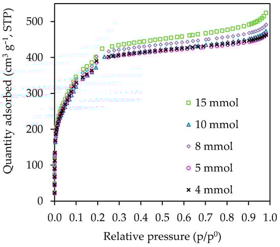 Figure 9 shows the N2 adsorption isotherms at −196 °C of the MIL-101(Cr)-SO3H samples synthesized with increasing doses of acetic acid. These have a similar topology to those already shown in Figure 5 (type IVb), resembling two consecutive steps corresponding to the filling of the micropores and the mesopores, respectively.