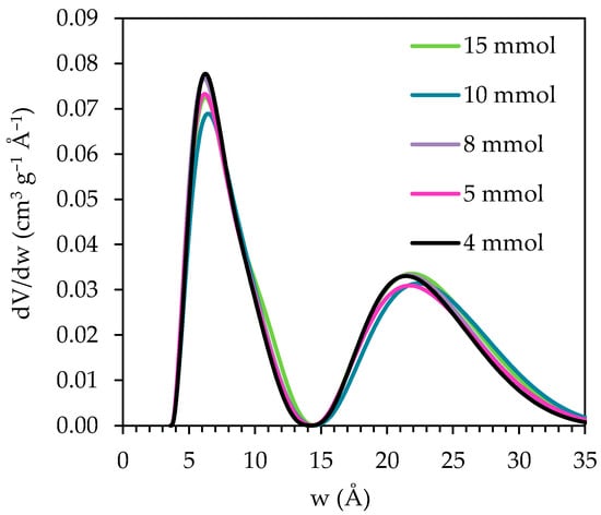 Figure 10 represents the PSD of the MIL-101(Cr)-SO3H samples synthesized with varying amounts of acetic acid. A bimodal PSD with maxima at 6 Å and 22 Å is observed for all the samples, except for the sample synthesized using 10 mmol of acetic acid, which presents the second maxima slightly displaced to 23 Å. This bimodal PSD is attributed to the pentagonal windows with 5–12 Å pore width and pentagonal–hexagonal windows with 12–20 Å pore width of MIL-101(Cr), as already discussed in Section 3.1.