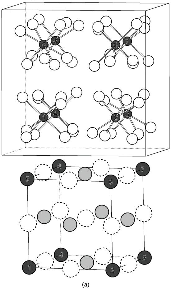 The Buckingham potentials used in calculations are listed in Table 1 [25,26]. The structural parameters of the current simulations are listed in Table 2. After bulk optimization, the relaxed lattice parameter is 10.285 Å (0.08 Å or 0.8%; smaller than the experimental result [22]), and the lattice energy is −138.273 eV. The relaxed crystal structure of the (a) unit cell and (b) octahedral coordination of 8b and 24d sites are shown in Figure 1.