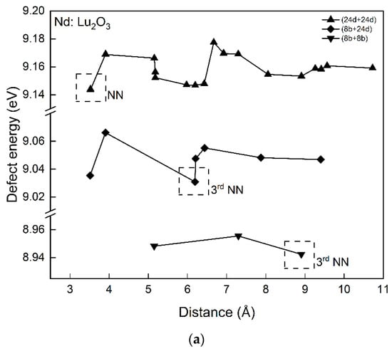 As shown in Figure 7, the defect formation energy depends on the sites (8b and 24d) occupied by the pair and the distance between two substitutional point defects. The dashed square highlights the lowest energy in each type of pair. The (8b + 8b) pair has the lowest defect formation energy, and the order of energetic favorability is (8b + 8b) > (8b + 24d) > (24d + 24d). This order is the same for Nd- and Er-doped systems. In an (8b + 8b) pair, the most favorable interatomic distance is 8.907 Å, which is the third nearest neighbor (3rd NN) separation. Similarly, the third nearest neighbor configuration is also the most favored by the (8b + 24d) pair, with interatomic distances of 6.191 Å and 6.186 Å for Nd and Er dopants. Only (24d + 24d) most favors the nearest neighbor (NN) configuration, with interatomic distances of 3.524 Å and 3.478 Å for Nd and Er, respectively. According to the Foxter–Dexter relation [17], the energy transfer probability between adjacent atoms is inversely proportional to the sixth power of interatomic distance. The order of energy-transferring probability between two rare earth dopants among the three dopant pairs is then (24d + 24d) > (8b + 24d) > (8b + 8b). Table 6 lists the defect energies and inter-dopant distances of the NN and third NN configurations for the three types of pairs for both Nd and Er. When positioning two dopants in close proximity, such as in the nearest neighbor (NN) configuration of (8b + 24d) and (24d + 24d), Nd: Lu2O3 exhibits a higher degree of structural relaxation compared with Er: Lu2O3. The relaxed inter-dopant distances for the (8b + 24d) and (24d + 24d) NN configurations in Nd: Lu2O3 are 3.513 Å and 3.524 Å, respectively, which are greater than those in Er: Lu2O3, 3.466 Å and 3.478 Å. This discrepancy can be attributed to the larger ionic radius of Nd relative to Er. Note that the differences in the defect energies between the NN and the third NN configurations of (8b + 8b) and (8b + 24d) are on a scale of 0.001 eV in both Nd and Er doping systems, indicating that both configurations will appear in experimental practice. As for (24d + 24d), the configurations that are energetically close to the NN are the sixth or seventh NN. The favorability of NN configuration is relatively more significant in Nd- than Er-doped Lu2O3. Considering that there are twice as many Lu 24d sites than Lu 8b sites in the structure and considering the relative favorability of NN configuration, the energy transfer probability between two rare earth dopants in the (24d + 24d) pair may be the highest.