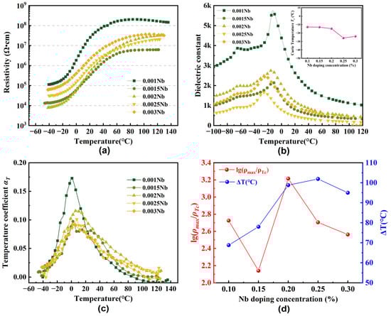 The resistivity-temperature (-) curves for specimens with varying Nb doping concentrations are displayed in Figure 1a. To clearly assess the resistivity-temperature response, is designated as the resistivity at −40 °C, since the resistivities exhibit a monotonic increase before the phase transition within the examined temperature range, as illustrated in Figure 1a. Additionally, the Curie temperature Tc of the ceramics is established by analyzing the dielectric constant–temperature curves presented in the Figure 1b inset. The temperature coefficient of resistivity () was calculated as follows: