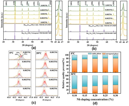 XRD patterns of the prepared Ba0.55Sr0.45Ti(1−x)NbxO3 ceramics: (a) 0 °C and (b) 20 °C. (c) A close observation in 2θ ranging from 45° to 47°. (d) Calculated relative quality percentages of tetragonal and cubic phases at 0 °C and 20 °C.