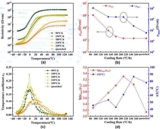 Figure 3a shows the - curves of the Ba0.55Sr0.45Ti0.9985Nb0.0015O3 ceramic specimens with different cooling rates. Compared with the specimen quenched, the PTC intensities of the others were enhanced significantly. Some of the resistivity jumps exceed three orders of magnitude. All the curves show almost plateau shapes after the phase transition. Within the entire testing temperature range, the resistivity and the temperature are positively correlated. Figure 3b shows the influence of the cooling rates on and . Both the and values increased with a decrease in the cooling rate. They show different changing characteristics. The values increased slightly from 1.4 × 104 Ω·cm to 1.8 × 104 Ω·cm when the cooling rate was higher than 180 °C/h and then increased sharply with the decrease in the cooling rate, while the values increased sharply at first from 5.9 × 106 Ω·cm to 1.6 × 108 Ω·cm when the cooling rate reduced to 210 °C /h from 250 °C/h and tended to become milder at the cooling rates of 210 °C/h, 180 °C/h, and 150 °C/h and then increase largely at 90 °C/h. The results indicate that the specimens with cooling rates of 180 °C/h and 210 °C/h could produce a large resistivity jump during the phase transition. The fluctuation of the temperature coefficient with temperature is shown in Figure 3c. Compared with the quenched specimen, all values of the specimens with different cooling rates were improved. Among them, the specimen with the cooling rate of 180 °C /h shows the largest increase, from 0.10 to 0.296, and the sharpest vs. curve, which reveals the narrowest phase transition temperature span. Figure 3d gives the cooling rate dependence of /) and ΔT. The magnitude of the resistivity change is higher than 3 for specimens with a cooling rate of 210 °C/h to 180 °C/h, reaching 3.3 and 3.1, respectively. The values of ΔT reduced significantly with the decrease in the cooling rate. Among them, the specimen with a 180 °C/h cooling rate shows the smallest value, ~38 °C.
