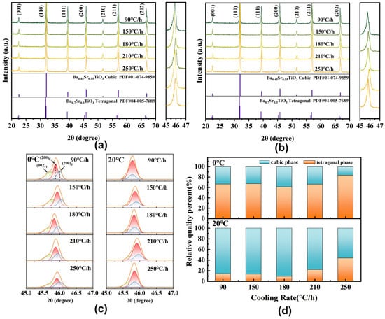 XRD patterns of Ba0.55Sr0.45Ti0.0085Nb0.0015O3 ceramic specimens with different cooling rates: (a) 0 °C and (b) 20 °C. (c) A close observation in 2θ ranging from 45° to 47°. (d) Calculated relative quality percentages of tetragonal and cubic phases at 0 °C and 20 °C.