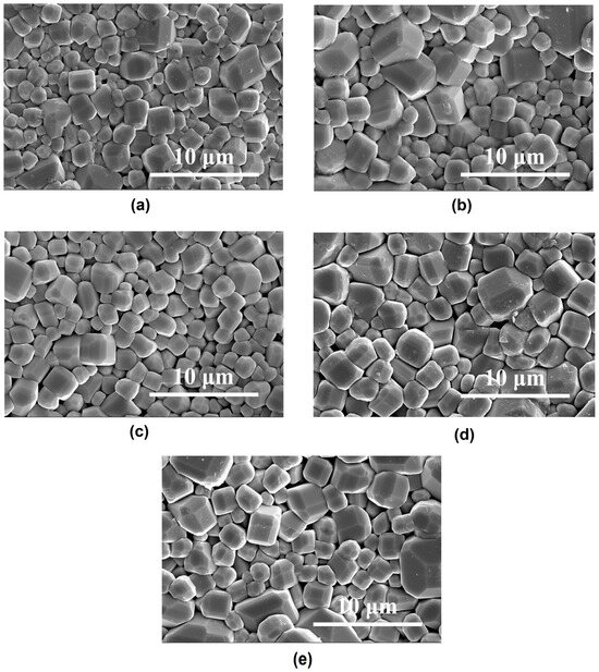 The surface morphology of the specimens with different cooling rates is shown in Figure 5. The SEM images indicate that there are little differences in grain morphology, as all the specimens were sintered at the same temperature. The grains are fully developed with sharp polyhedral edges, and the cleavage plane is distinct. The granular structures exhibit similar characteristics across all samples, with approximately 90% of theoretical density, grain sizes of about 2–3 μm, and a consistent size distribution, regardless of the cooling conditions. Figure 5 shows that, in our work, the morphology of the specimens is not significantly affected by variations in the cooling rate. The uniformity in morphology across all samples indicates that changes in electrical properties likely stem from the impact of defect restoration and/or adsorbed oxygen on the grain boundaries in the specimens by different cooling rate sintering processing.