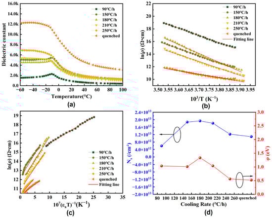 (a) Temperature dependence of the dielectric constant of the Ba0.55Sr0.45Ti0.0085Nb0.0015O3 ceramic specimens with different cooling rates. (b) ln(ρ) vs. 103/T and (c) ln(ρ) vs. 107/(T) of specimens with different cooling rates. (d) Ns and φ vs. cooling rates.