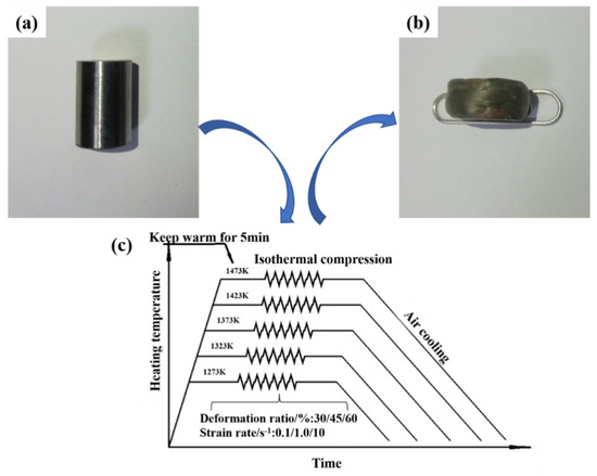 The specimens used in the thermal compression simulation experiment were cylinders with specifications of Φ10 mm × 15 mm obtained by wire cutting titanium alloy ingots with DK7735 taper type EDM wire cutting machine. The thermal simulation compression test was conducted on a Gleeble-1500D simulator, with tantalum pads at both ends of the specimen to ensure the flatness of the upper and lower ends of the specimen and to reduce the friction between the indenter and the specimen; the specimen was heated to the deformation temperature at a heating rate of 10 K/s, and the isothermal deformation was carried out after holding for 5 min. The specific experimental steps and samples before and after deformation are shown in Figure 2.