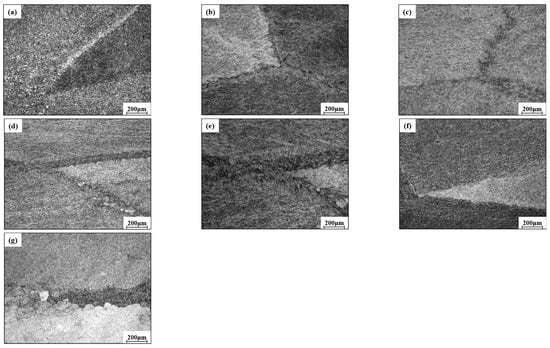 Microstructure of cast TC21 titanium alloy under different deformation conditions after heat treatment: (a) T = 1273 K, = 0.1 s−1, R = 30%; (b) T = 1273 K, = 0.1 s−1, R = 45%; (c) T = 1273 K, = 0.1 s−1, R = 60%; (d) T = 1373 K, = 0.1 s−1, R = 30%; (e) T = 1473 K, = 0.1 s−1, R = 30%; (f) T = 1273 K, = 1 s−1, R = 30%; (g) T = 1273 K, = 10 s−1, R = 30%.
