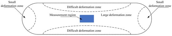 During thermal deformation, the internal organization of the material directly affects the mechanical properties of the products it manufactures, and because the stresses on the material are not uniform during compression, this leads to different deformation zones in the cross section, mainly difficult, small and large deformation zones [19], as shown in Figure 6. The large deformation zone experiences the greatest stress under the combined action of high temperature and external forces, resulting in significant recrystallization phenomena, while the small and difficult deformation zones experience lower stress and a lower degree of recrystallization. The deformation in the core of the specimen is uniform; the organizational state is representative, and it can accurately reflect the overall performance of the material. In order to investigate the dynamic and static recrystallization of cast TC21 titanium alloy after heat treatment, the tissue photographs of the core of the specimen were used as the object of dynamic and static recrystallization statistics. The alloy recrystallization was quantitatively analyzed with the help of image-processing software Adobe Photoshop CS (PS) and image analysis software Image-Pro Plus6.0 (IPP6.0) for the subsequent establishment of dynamic and static recrystallization, which provided reliable and detailed data support for the establishment of dynamic and static recrystallization kinetics.