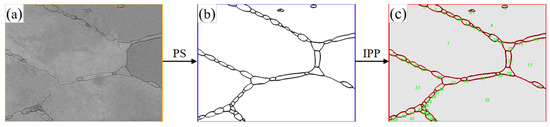 Image processing and recrystallization volume fraction calculation process: (a) Original image; (b) Processed image; (c) Grain statistics.
