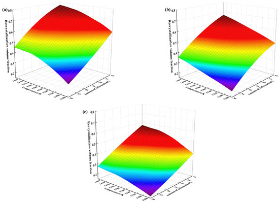 Volume fraction of recrystallization of the specimen after thermal deformation and heat treatment: (a) 0.1 s−1; (b) 1.0 s−1; (c) 10 s−1.