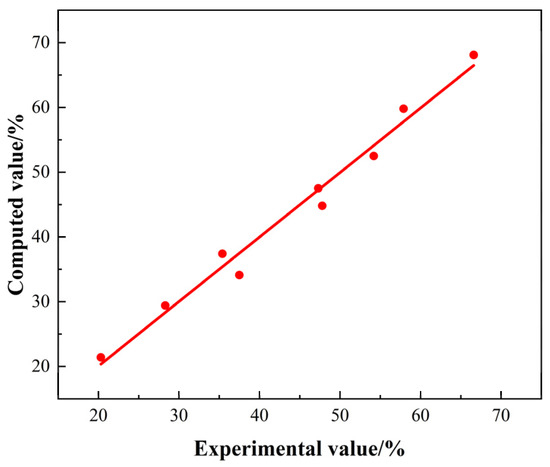 In order to get a more objective and clear understanding of the agreement between the calculated and experimental values of the dynamic and static recrystallization volume fractions, the experimental values of dynamic and static recrystallization volume fractions were compared with the calculated values, and the comparison results are shown in Table 3. The correlation between the experimental values and the calculated values of the prediction model constructed in this study was derived by linearly fitting the experimental values to the calculated values, as shown in Figure 9. It is obvious from Table 3 that the experimentally measured values of recrystallization volume fraction under each condition do not differ much from the computed values. The maximum absolute error value of 3.4% occurs at a deformation temperature of 1273 K and a strain of 0.6. The minimum error of 2.0% occurs at a temperature of 1273 K and a strain of 0.9. The correlation coefficient between the experimental value of dynamic and static recrystallization volume fraction and the calculated value of the model is R2 = 0.97993. In the comprehensive analysis, the prediction model constructed in this study can describe the recrystallization behavior of the casting TC21 titanium alloy in the process of heat deformation to a certain extent.