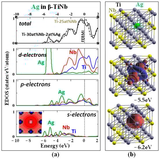 The β-TiNbAg electronic density of states (EDOS) is presented in Figure 1a. The inclusion of Ag in β-TiNb exhibits a new broad energy state around −6 eV from the Fermi level compared to the pure β-TiNb as can be seen in the total electronic density of states (EDOS) (Figure 1a). This electron energy state is mainly due to Ag 4d electrons, while at −5.5 eV it shows Ag 4d–Ti 3d hybridizations along the [110] and [−110] crystal directions (Figure 1b). The electron occupation close to the Fermi level is mainly due to Ti and Nb atoms that are mainly responsible for the metallic character of the material. In addition, the lowest valence electron state at −6.2 eV has clearly a Ag 5s character and an antibonding character with respect to the Ti neighbouring atoms, as presented in the (001) WF projection in the inset of Figure 1a. The presence of bonding and antibonding states at energies far from the Fermi level introduces system instability [6,21,46,47,49].