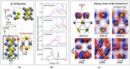 We first created two surface-oriented unit cells along the (001) and (110) directions. In Figure 2a, the β-TiNb along the (110) is presented. We repeated these unit cells 10 times along the (001) or (110) directions, thus creating a slab with 20 atomic planes. During the DFT calculation, we increased the simulation length perpendicular to the surface plane to be at least twice the slab length while we periodically reproduced the in-plane direction to mimic the infinite plane. We also used a 20 × 20 × 1 k-point mesh, as depicted in the blue arrow of Figure 2a.