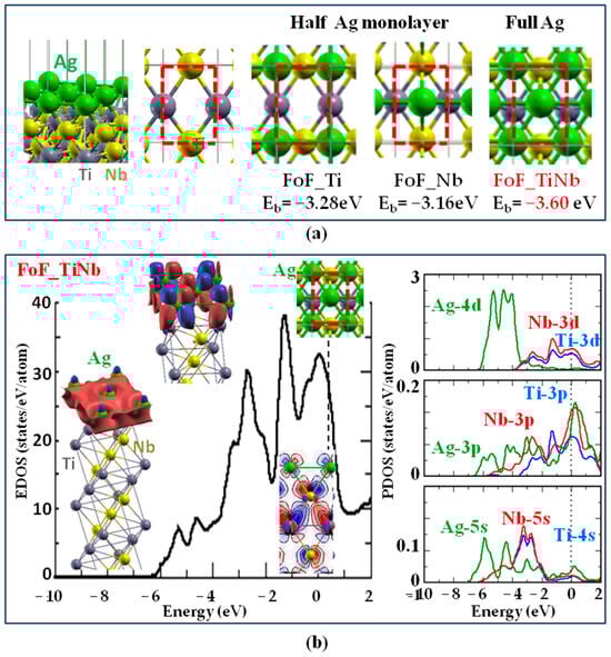Aiming to introduce antibacterial properties at the β-TiNb surface, the Ag atom and monolayer were considered and studied using DFT calculations. In Figure 3a, the main adsorption sites of Ag on β-ΤiNb(110) surface are presented along with the surface unit cell (dashed red rectangle). The first site is the one with Ag deposited over a second layer atom, known as the four-fold (FoF) position due to its quadruple symmetry. This position is herein named FoF_Ti or FoF_Nb site for the cases of Ti or Nb second-layer atom. Due to the periodically reproduced surface slab, the Ag deposition on FoF_Ti or FoF_Nb results in Ag surface semi-coverage, while when both sites are occupied by Ag atoms, they createfull adlayer surface coverage. We also adsorb Ag on top of a Ti surface atom (we name this site OnTi) and on both Ti and Nb surface atoms (we named OnTiNb) not presented in this Figure. It should be noted that upon relaxation the OnTi and OnTiNb sites are not stable but the Ag adatom is relaxed towards the four-fold sites.