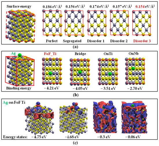 Aiming to approach the solid solution features of the β-TiNb, we increased the size of the cell, creating a slab with 108 atoms, and randomly changed the positions of the Ti and Nb surface atoms, creating several configurations as presented in Figure 4a. In these systems, the two bottom layers were frozen in order to mimic the bulk β-TiNb system. All disorder cases having surface energy 0.174 eV/Å2, 0.157 eV/Å2, and 0.154 eV/Å2 along with the segregated surface layer (0.156 eV/Å2) were energetically favoured compared to the perfect β(110) configuration (0.186 eV/Å2)) as presented by the calculated surface energy. Choosing the third disorder surface with 0.154 eV/Å2, we adsorbed an Ag adatom on several sites. In Figure 4b, the Ag FoF_Ti is considered, having a binding energy of −4.21 eV, which is much lower than the periodic Ag monolayer of Figure 3.