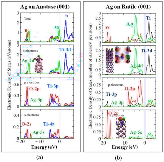 The study of the wavefunctions of the Ag-coated TiO2 surfaces offers useful information for a better understanding of the created bonds and the coating stability. In the inset of Figure 5b, selective wavefunctions are depicted along with available hybridizations between silver and oxygen and/or titanium atoms. In the inset of s-electrons EDOS, the wavefunction corresponding to an energy E = −16.1 eV is depicted mainly due to oxygen s orbitals (red enhanced spheroid area), which form weak directional hybridizations with the Ag-3deg electrons (the deg electrons correspond to or orbital that have their lobes along the z or x and y axis). In addition, the highest occupied wavefunction is presented in the inset of d-electron PDOS, where a high density of electrons is observed due to the surface oxygen 2p orbitals which form bonds with the Ag 3deg orbitals. Silver also has two unbonded 4d electron lobes located vertically to the surface layer that might be considered as dangly bonds, enhancing the surface activity.