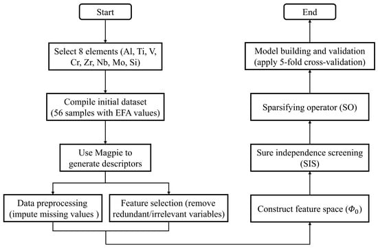 The traditional approach to discovering and characterizing new materials has been largely empirical and iterative, involving extensive experimental trials and characterizations. Computational methods, such as first-principles calculations and phase diagram analyses, have been crucial in predicting the material’s various properties [18,19,20], thereby accelerating the development of new materials. However, these traditional computational techniques can be computationally intensive and time-consuming, particularly for the vast compositional space of HEMs when calculating the EFA. With the advent of machine learning (ML) techniques, the field of materials science has witnessed a significant shift towards a more data-driven and predictive approach [21,22,23]. ML algorithms have been successfully applied to model complex relationships between material compositions, structures, and properties, enabling the rapid identification of promising materials and the optimization of their properties [24]. In the context of HEMs, ML has been particularly impactful, with studies demonstrating the ability to predict phase stability, mechanical properties, and other critical characteristics with high accuracy [25,26,27].