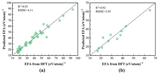 Predictions of EFA for (a) the training set of 45 samples and (b) testing set of 11 samples using the SISSO model against real values from DFT simulations in [32].