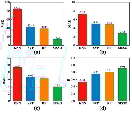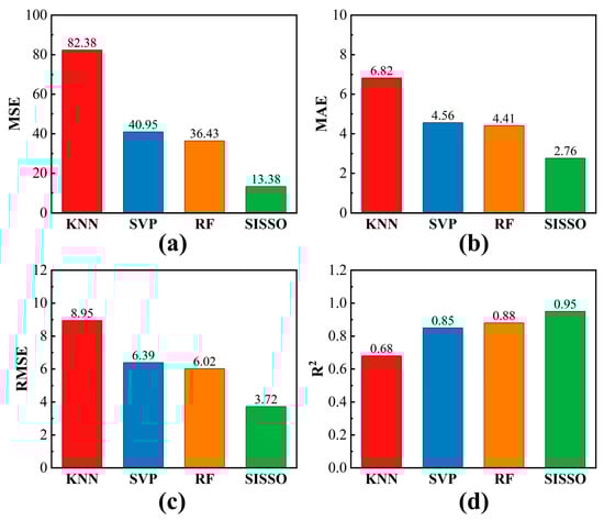 Comparison of (a) MSE, (b) MAE, (c) RMSE, and (d) R2 across the four machine learning models on the testing set. The red, blue, orange, and green bars represent the performance of KNN, SVP, RF, and SISSO, respectively.