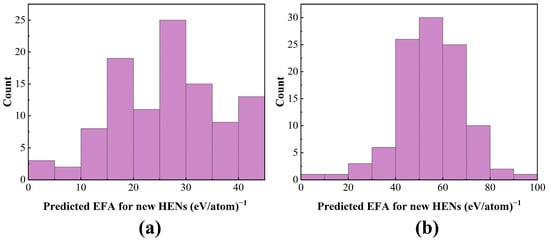 EFA distribution histogram of predicted 210 new high-entropy nitride ceramics (a) with Si (b) and without Si.