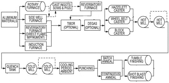 Figure 1 displays the production line of the slug/blank materials from the recycled aluminum materials and primary aluminum. These slug/blank materials will be used in the aluminum container (bottle) in the next step through the different methods. It is intended to produce the Al bottle with new alloys combined from two materials; commercially pure aluminum and recycled aluminum alloys (e.g., used beverage can- UBC). The recycled aluminum scrap might consist of aluminum alloys such as 3005, 3104, 3105, 3003, 3013, or 3103. First, the materials are melted in some melting furnaces such as reverbatory furnace, side well furnaces and rotary furnaces. To minimize the oxidation or melt loss of the recycled materials (UBC), it is recommended to use the furnace with the indirect heat systems (e.g., side well furnaces and rotary furnaces) rather than the furnace with a direct contact with the aluminum scrap (reverbatory furnace). In the side well furnaces and rotary furnaces, the molten metal is first cast into ingot, sow, or pigs. Then, they are remelted in a reverbatory furnace to adjust the desired chemical compositions (Figure 1) [3,4].